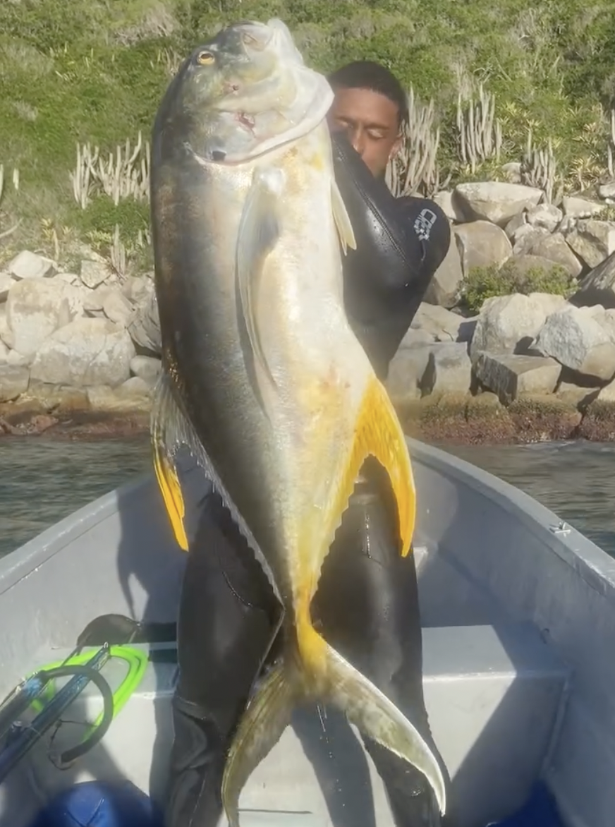 O pescador Guilherme Souza viralizou nas redes sociais ao compartilhar uma pesca impressionante: um peixe da espécie xaréu – Caranx hippos – de 28,45 kg capturado em Arraial do Cabo.